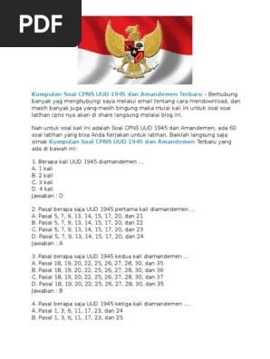 Soal Cpns Uud 1945 Pdf / Soal Twk Radikalisme Pdf : Perguruan tinggi ini terletak di sekaran, gunungpati, daerah dataran tinggi di bagian selatan kota semarang. Fakir miskin dipelihara negara diatas hanyalah garis besar dari isi uud 1945 13. Sistem hukum indonesia merupakan perpaduan beberapa sistem hukum. Sistem hukum indonesia merupakan perpaduan dari hukum agama, hukum adat, dan hukum negara eropa terutama belanda sebagai bangsa yang pernah menjajah indonesia. Sistem jaminan sosial agar mudah dihafal. Ketentuan selanjutnya dalam uu *disclaimer :